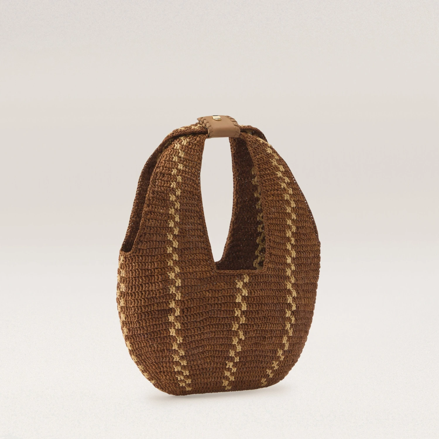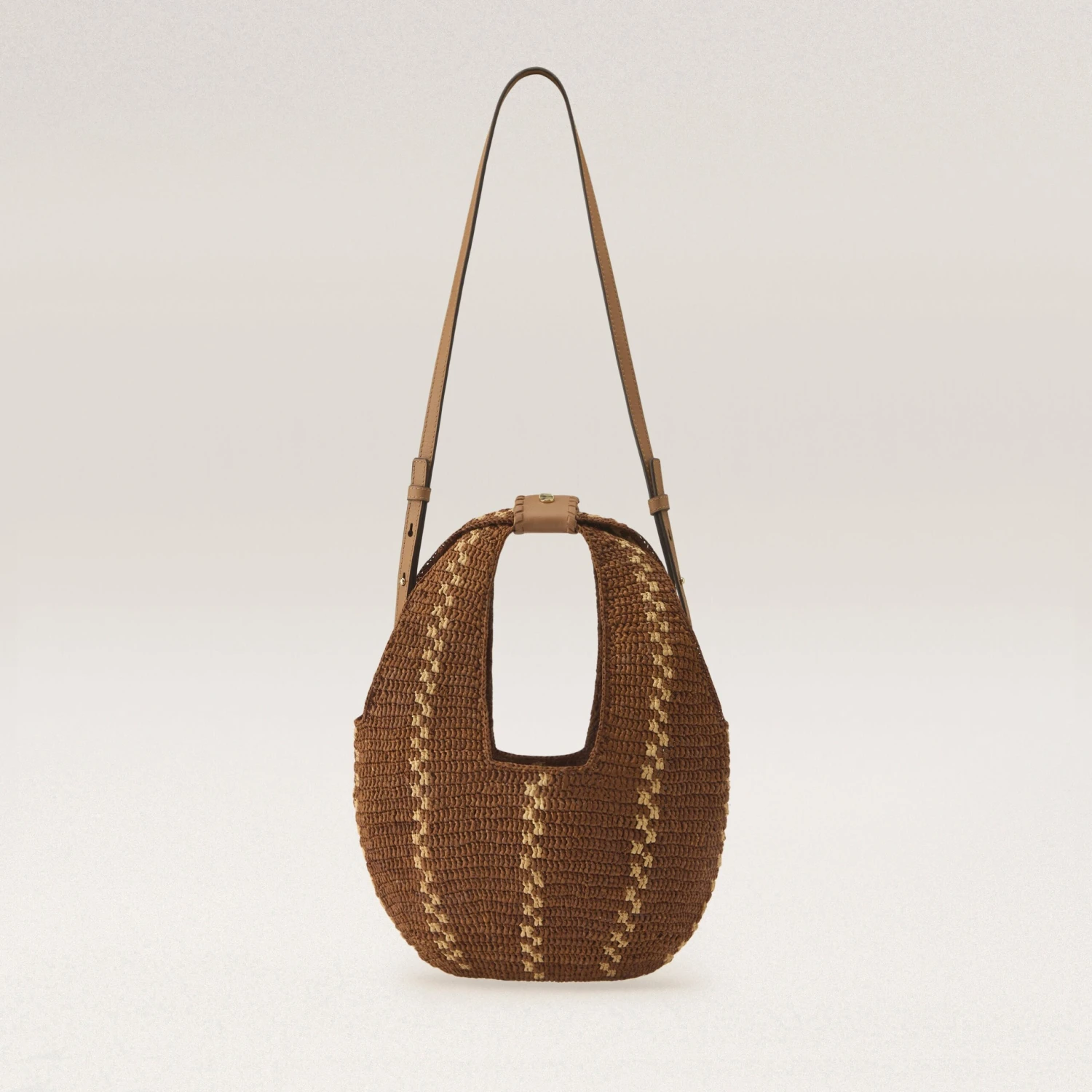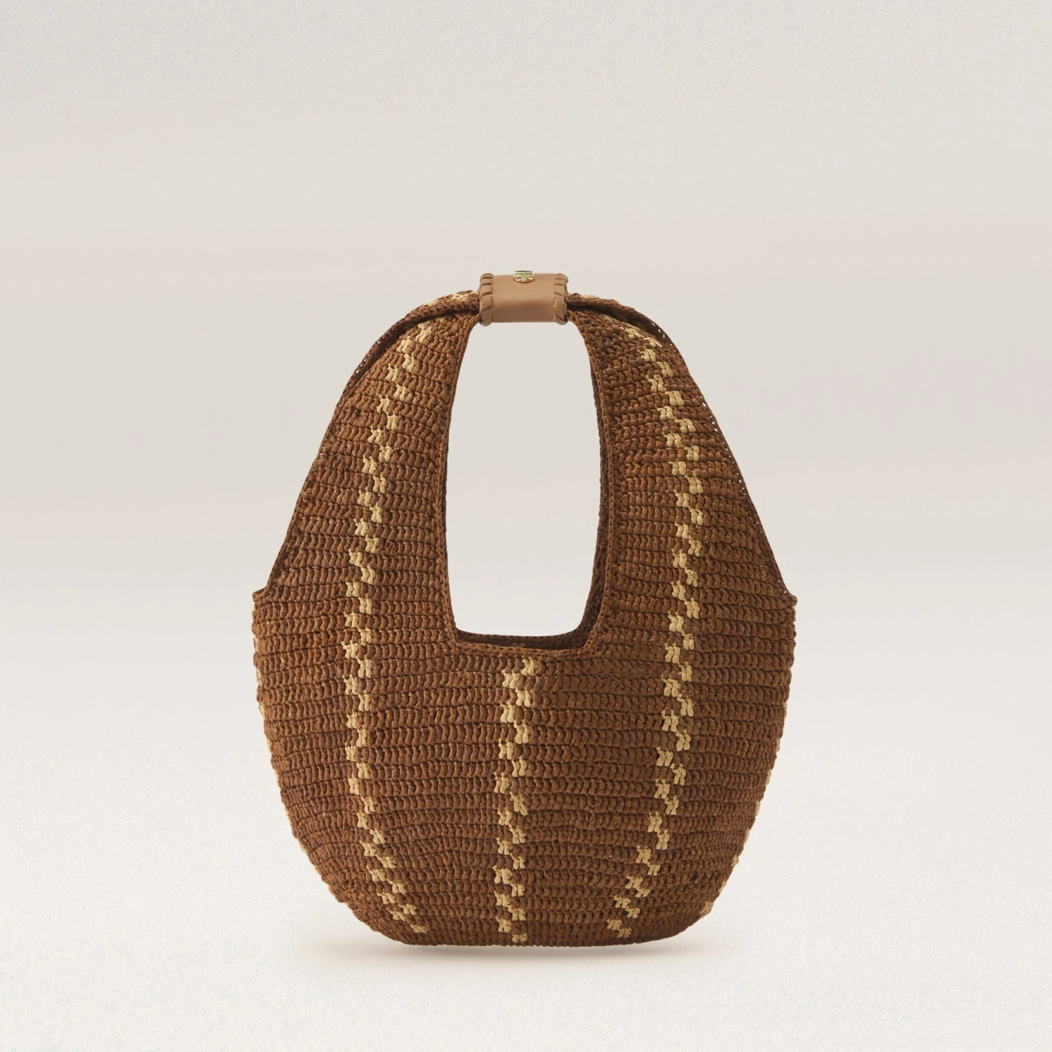 Introducing the Aquarius Mini Hobo Bag, the showpiece of the season. Handcrafted from raffia crochet in the intricate Kūru stitch, this bag features a captivating vertical stripe contrast that enhances its unique design. The LWG certified leather strap and handles, adorned with whipstitch detailing, add a touch of elegance, while the signature seed snap button offers a secure closure. If there is one Helen Kaminski item to purchase, this is the one!