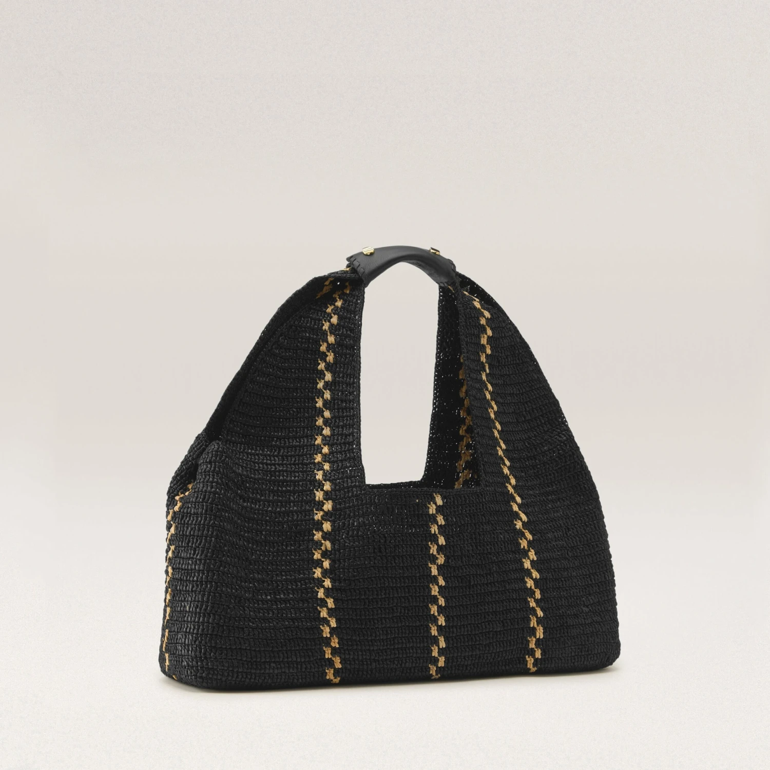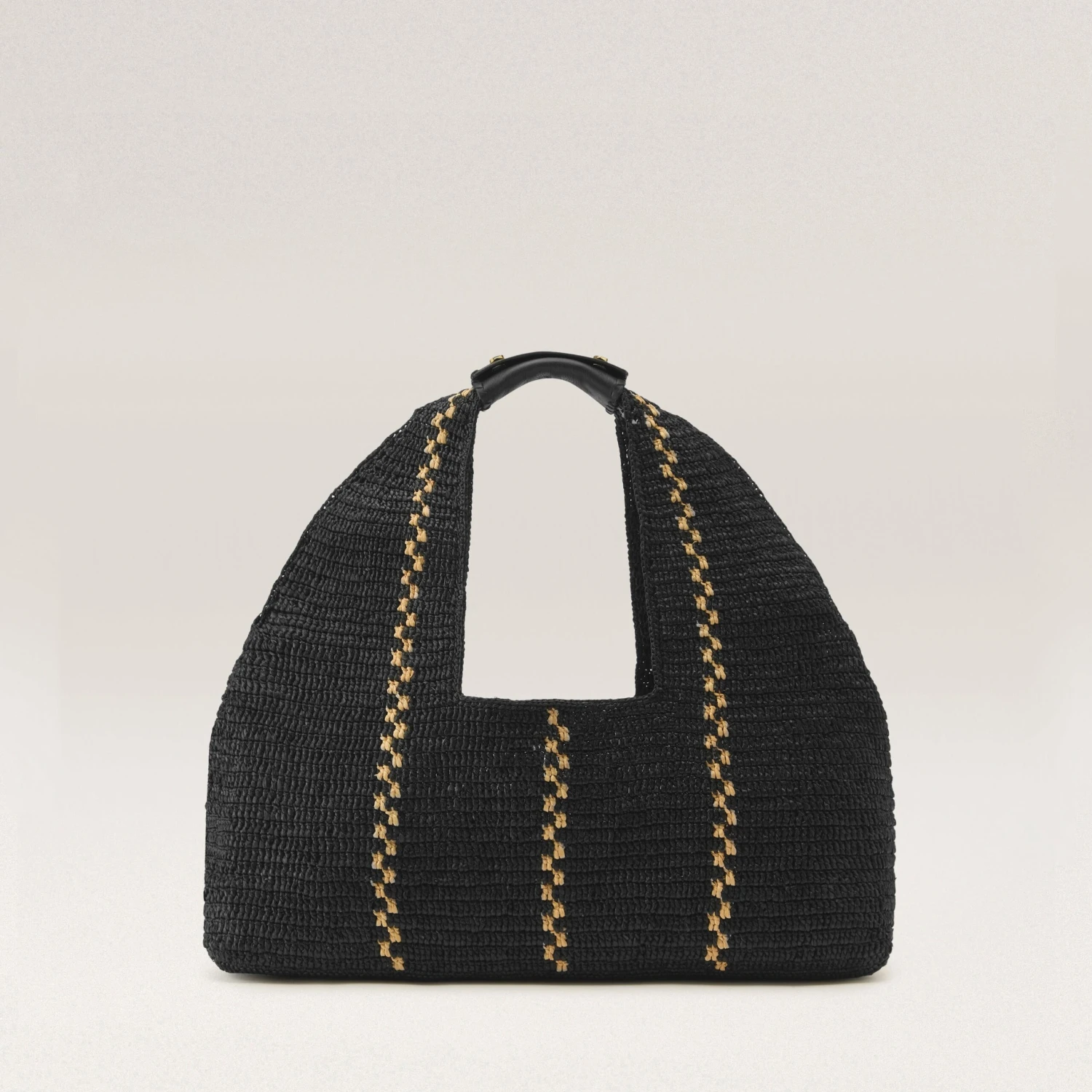 Euphoria Large Tote is the tote of the season! Hand-crafted from raffia crochet in a unique Kūru stitch, it features a striking vertical stripe contrast for added flair. The tote is equipped with LWG-certified removable leather handles adorned with whipstitch detail and signature seed snap buttons. Unlined for a lightweight feel, with a comfortable handle drop of 24cm, making it both stylish and practical for everyday use.
