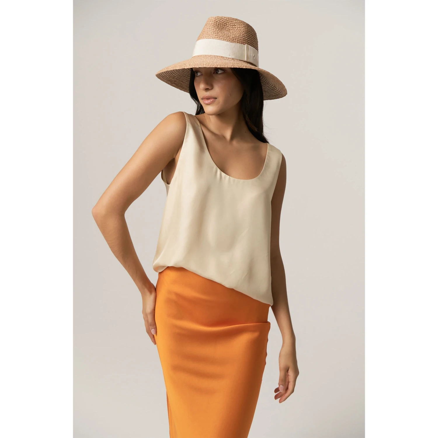 Immerse yourself in luxury with the soft, creamy hues of the Farida Hat, designed to complement any ensemble with grace and charm. A classic silhouette that boasts a wide brim, providing both sun protection and a touch of old-world glamour reminiscent of chic resort destinations and leisurely afternoons spent in the sun.
