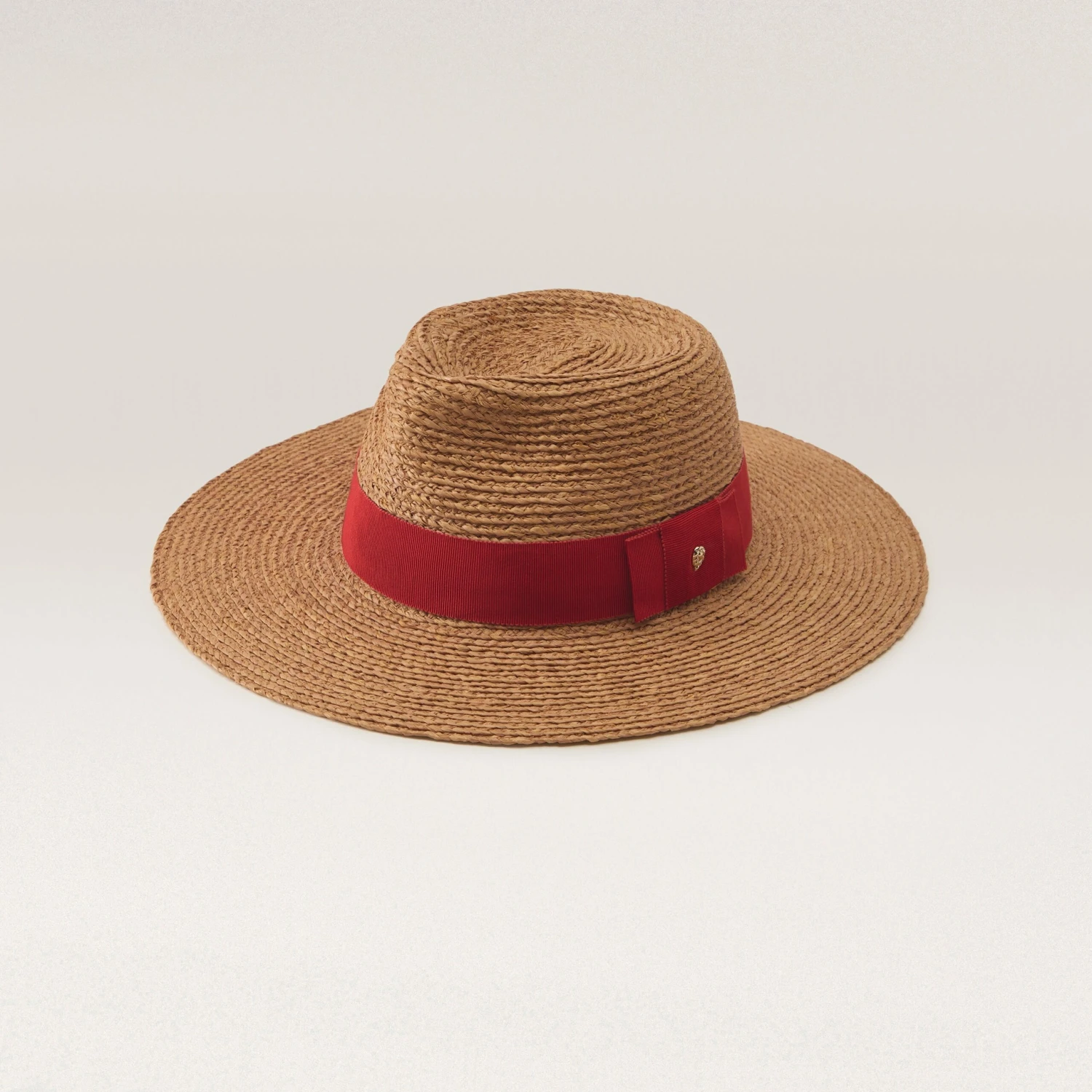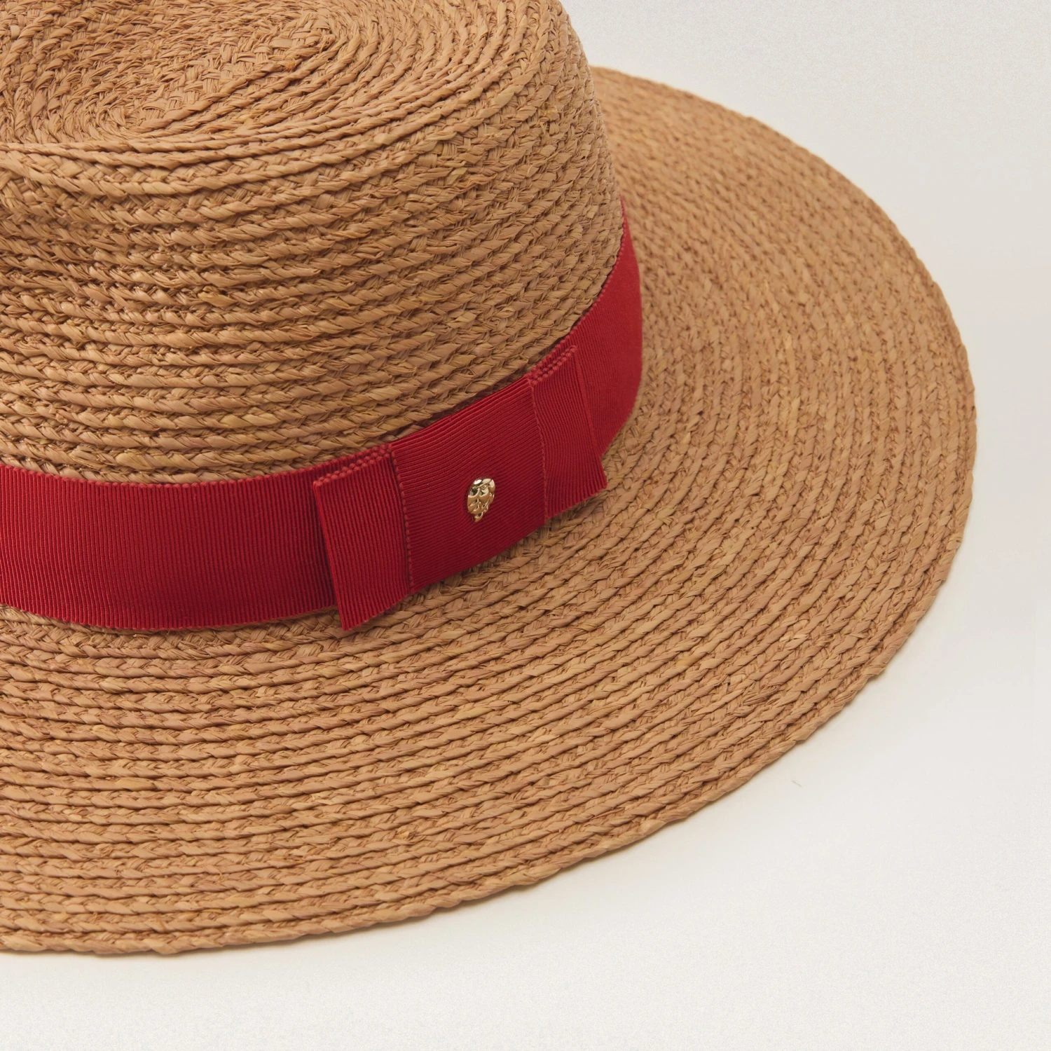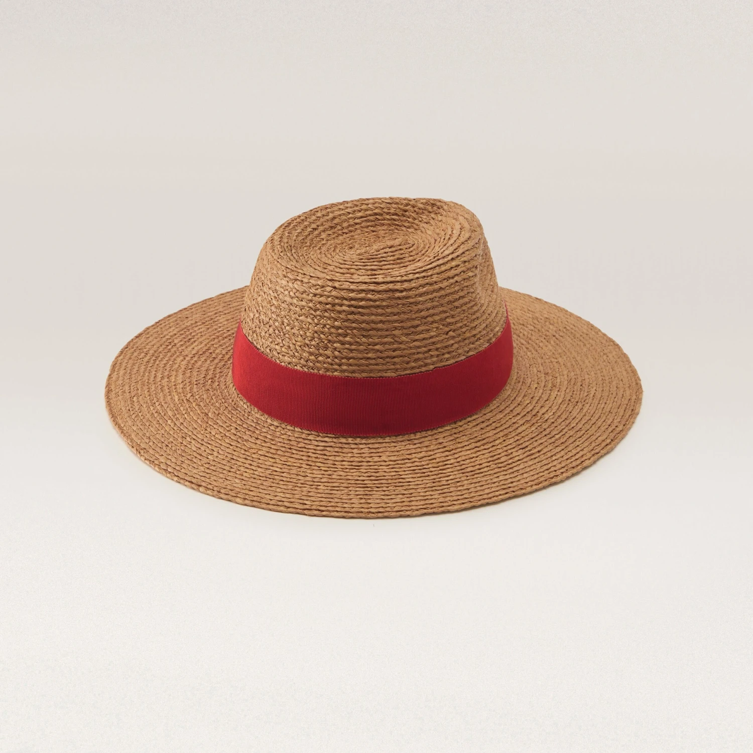 Jenna Wide Brim Fedora features a stylish flat brim and is hand-crafted from raffia braid, offering a sophisticated look. Accented with a chic bow detail, it includes a size-adjustable inner band for comfort and provides UPF 50+ protection for sunny days.