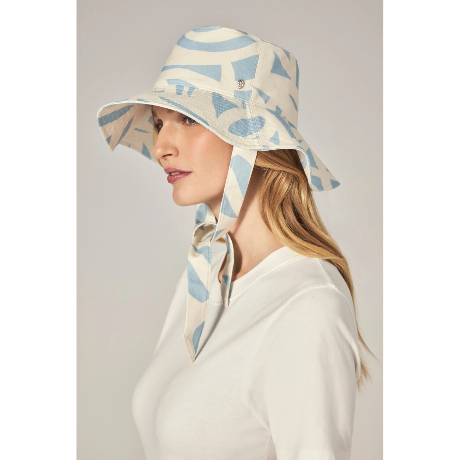 Malibu bucket hat features an exclusive geometric print inspired by the ocean, bringing a fresh, coastal vibe to your look. Made from organic cotton yarn, it offers adjustable chin strap ties in the same vibrant print and provides UPF 50+ protection for sunny days.