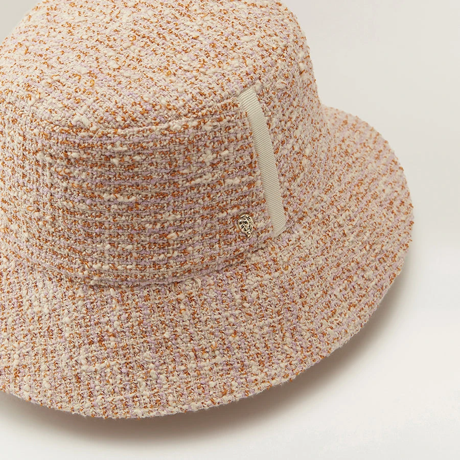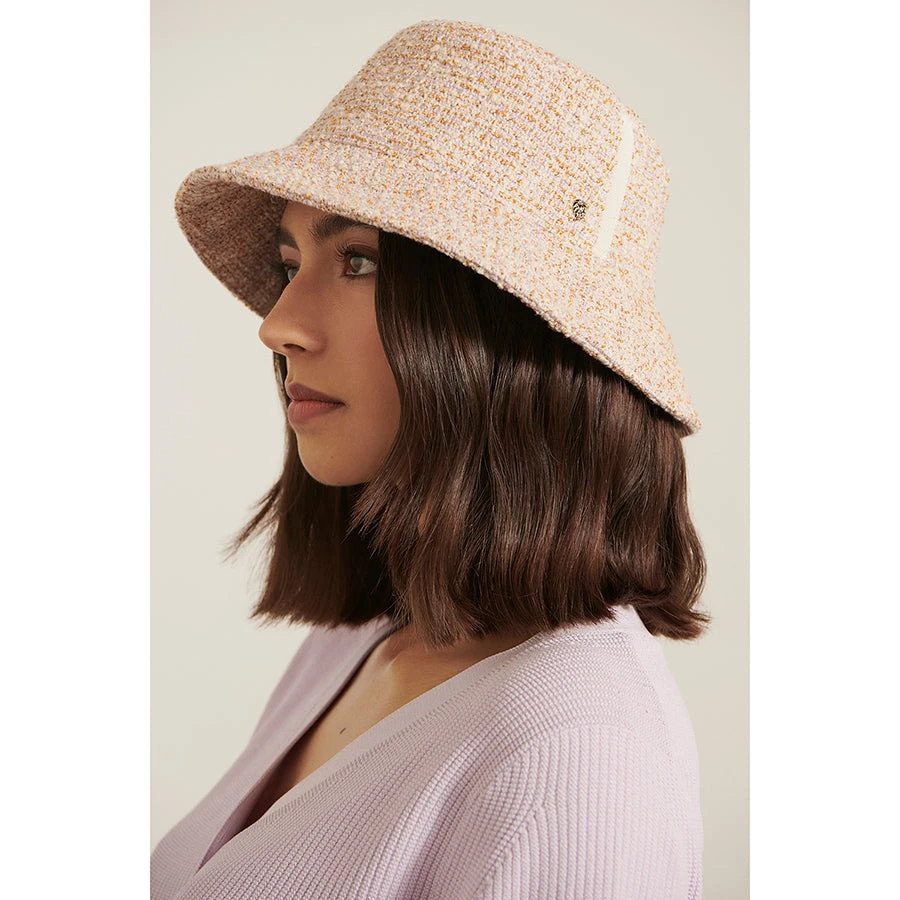 Grounded in sophistication and textural detailing, the short-brimmed bucket hat, Sapo draws inspiration from the quintessence of transeasonal styling. A dream of tone and texture – this piece is beautifully crafted from luminous European Boucle fabric with a FSC certified Grosgrain ribbon detailing on the side of the crown. This season we introduce a fun and optimistic Lavender/Golden Harvest colour mix to the collection.