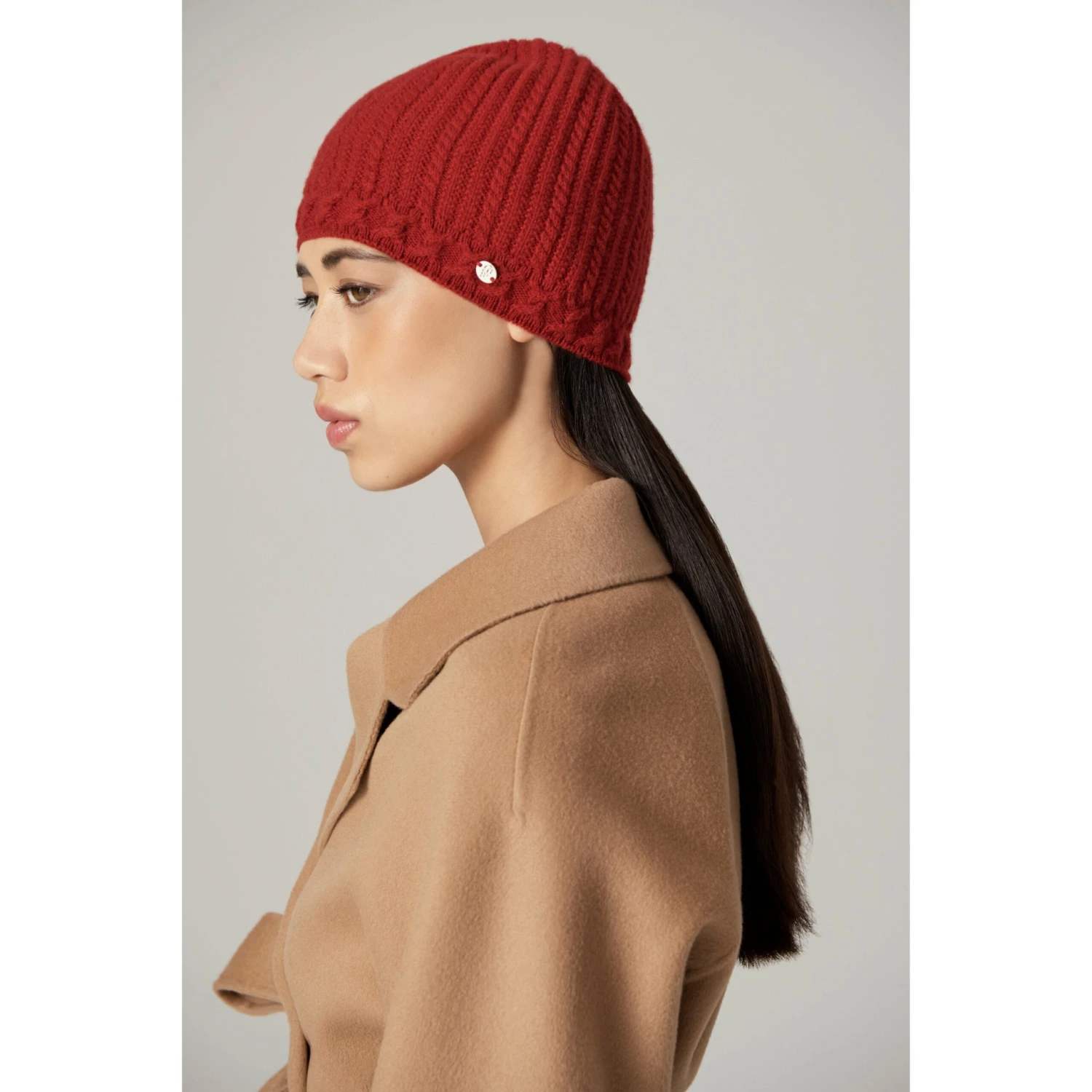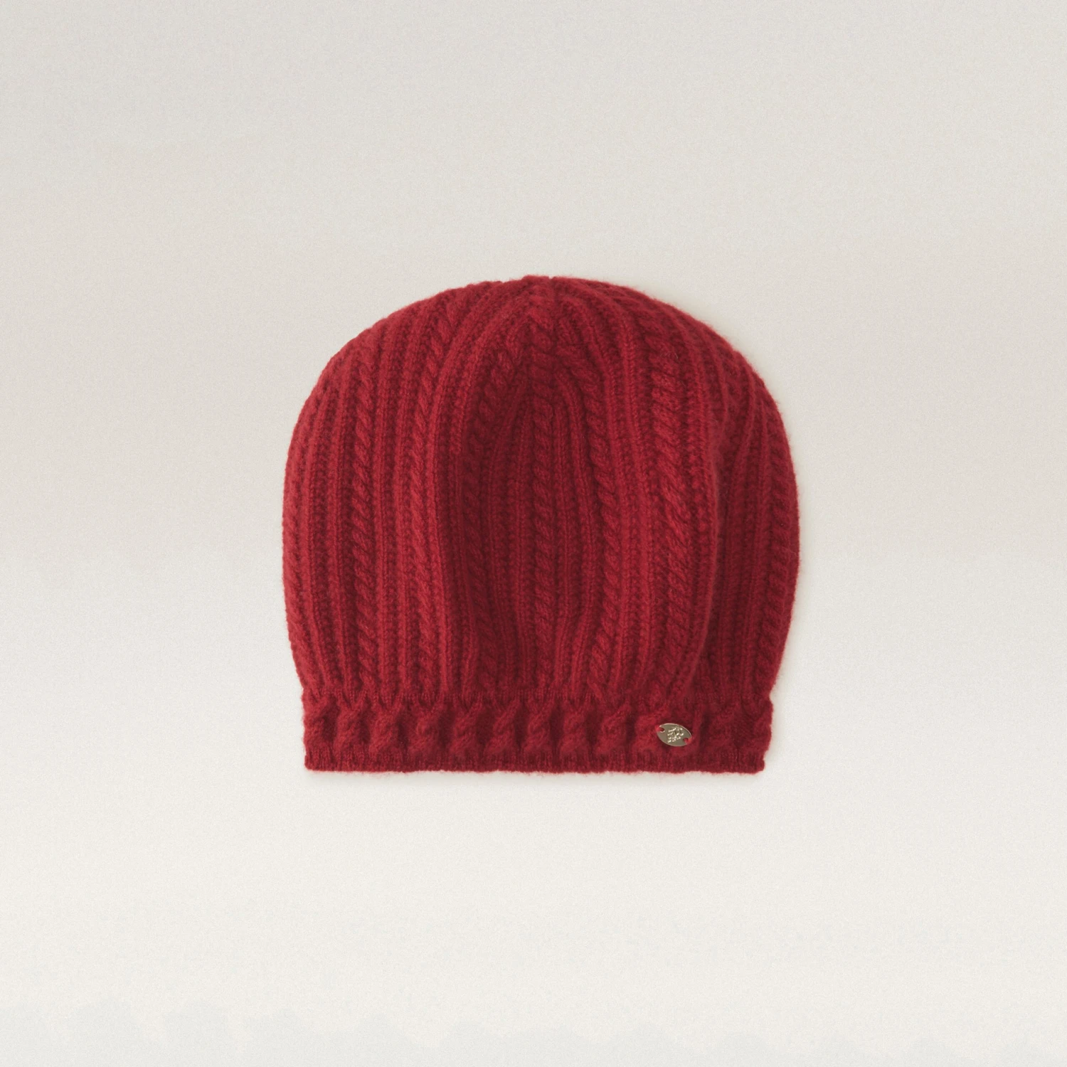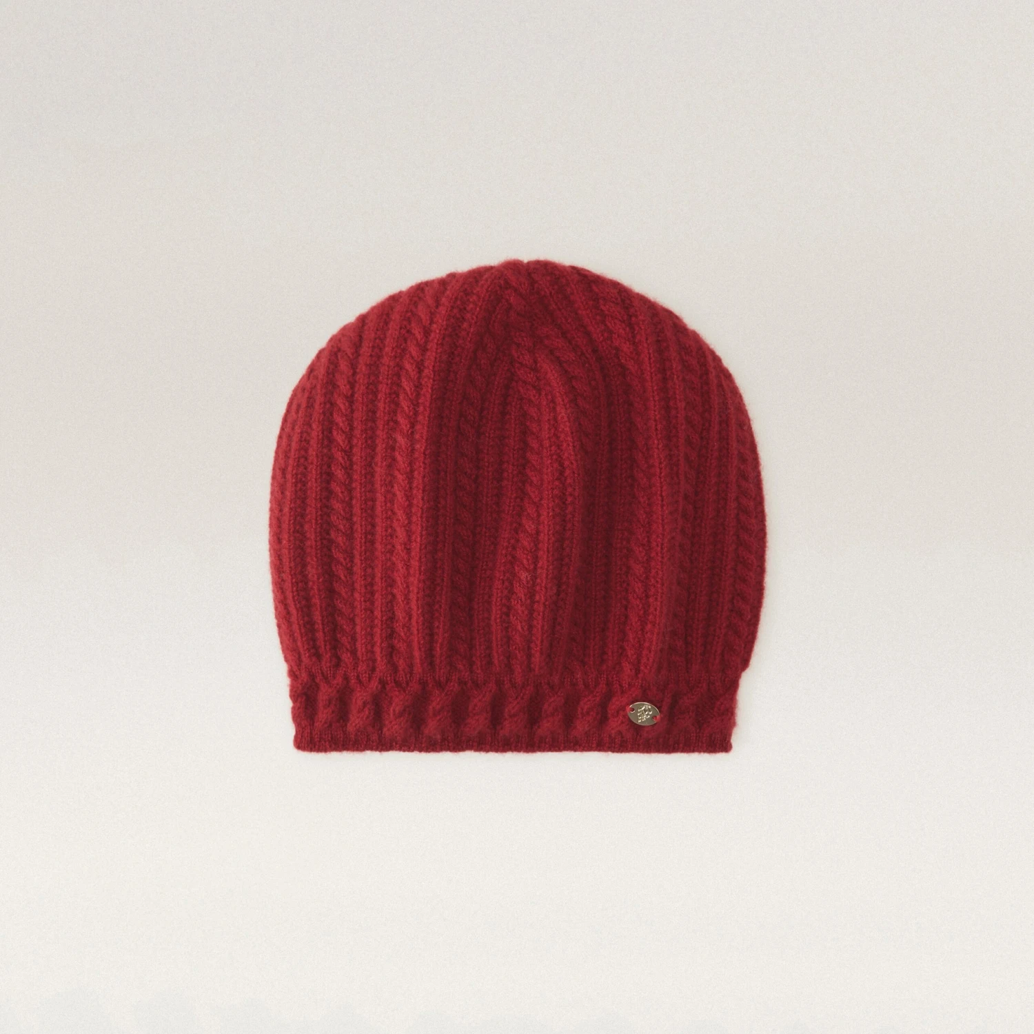 The Simone slouch beanie features a filigree and cable rib design. Crafted from 100% Cashmere Yarn, certified by The Good Cashmere Standard®, ensuring both luxury and sustainability.